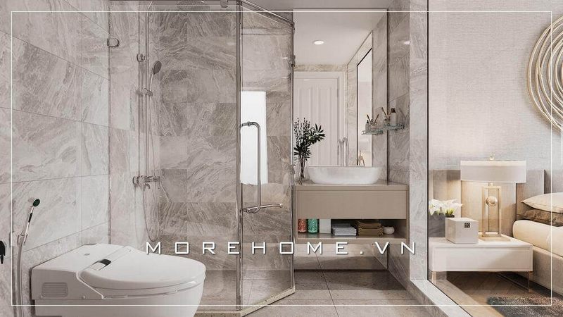 Thiết kế phòng tắm chung cư hiện đại, thoáng rộng khi kết hợp với các vật liệu như gạch và kính