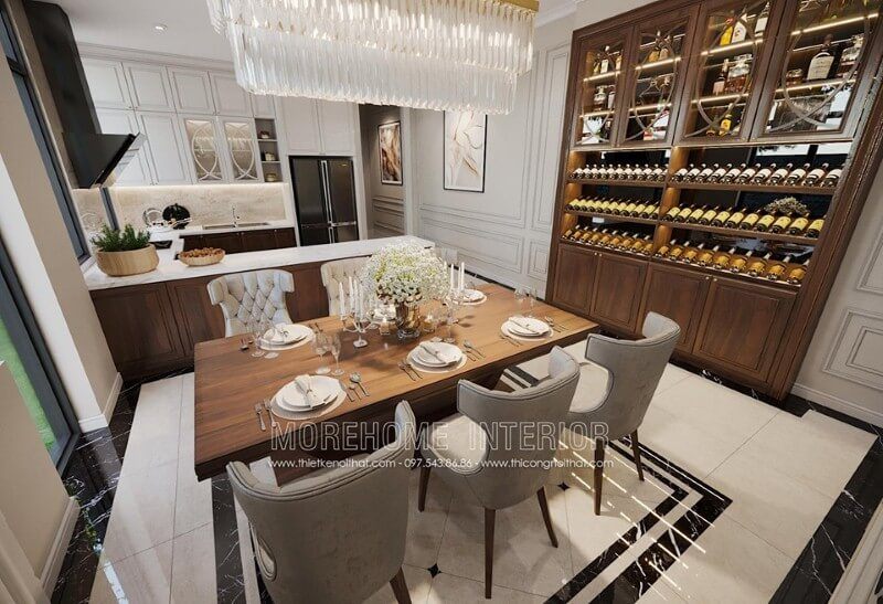 Thiết kế bàn ăn đẹp mang tông màu veneer nâu sữa phù hợp với phong cách thiết kế của căn nhà.