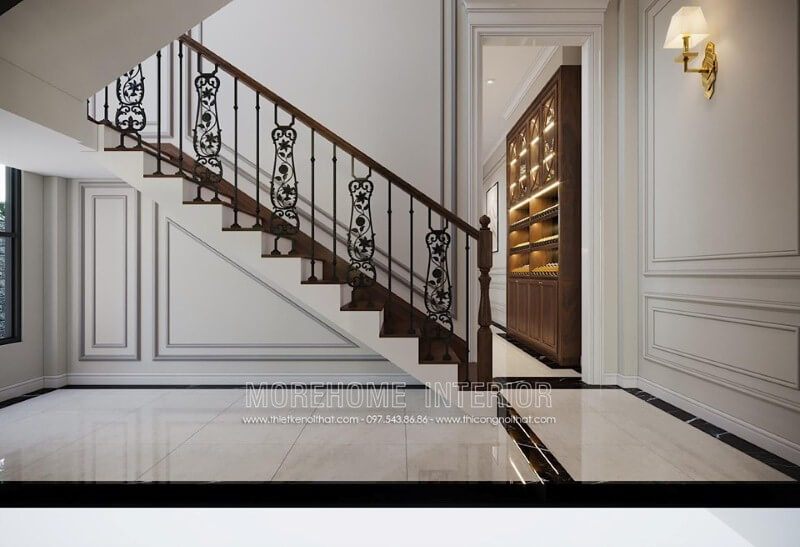 Cầu thang gỗ óc chó tân cổ điển tay vịn gỗ song sắt hoa văn trang trí đẹp mắt cho biệt thự, nhà phố.
