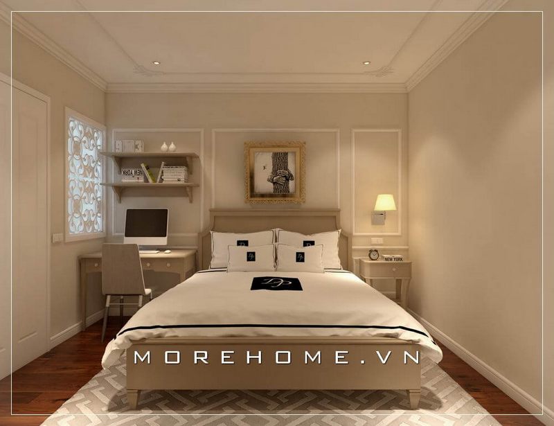 Trang trí nội thất phòng ngủ sơn trắng kết hợp điểm nhấn gỗ tạo nét độc đáo sang trọng.