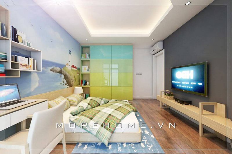 Thiết kế nội thất phòng ngủ dành cho bé trai độc đáo với mẫu dán tường 3D độc đáo, cảnh quan sinh động mang lại màu sắc cho phòng ngủ của con