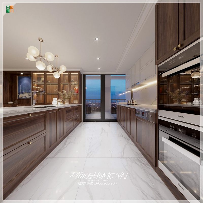 Nội thất phòng bếp tân cổ điển tone màu trắng sang trọng được thiết kế cho nhà chung cư.