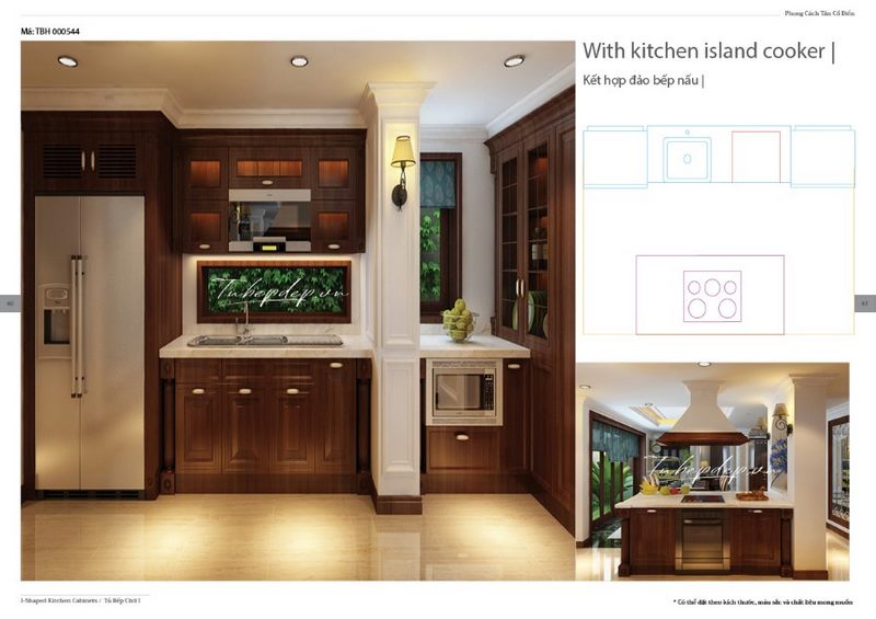 Tủ bếp chữ L tân cổ điển giúp gia chủ tối ưu hóa sử dụng không gian góc của ngôi nhà của họ. Phần đảo bếp được đặt ở giữa, tạo nên sự tiện nghi. Đây là một trong những mẫu thiết kế tủ bếp gỗ tự nhiên đang được ưa chuộng trong vài năm gần đây.