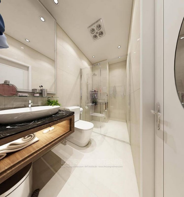 Thiết kế phòng tắm của căn hộ hiện đại, nhẹ nhàng với sự kết hợp của các vật liệu như kính, đá và gương treo sẽ giúp không gian trở nên rộng rãi hơn.